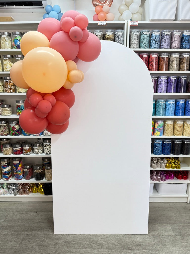 Arch board is 1.8m tall and 80cm wide. Balloon garland adds extra height and width.
