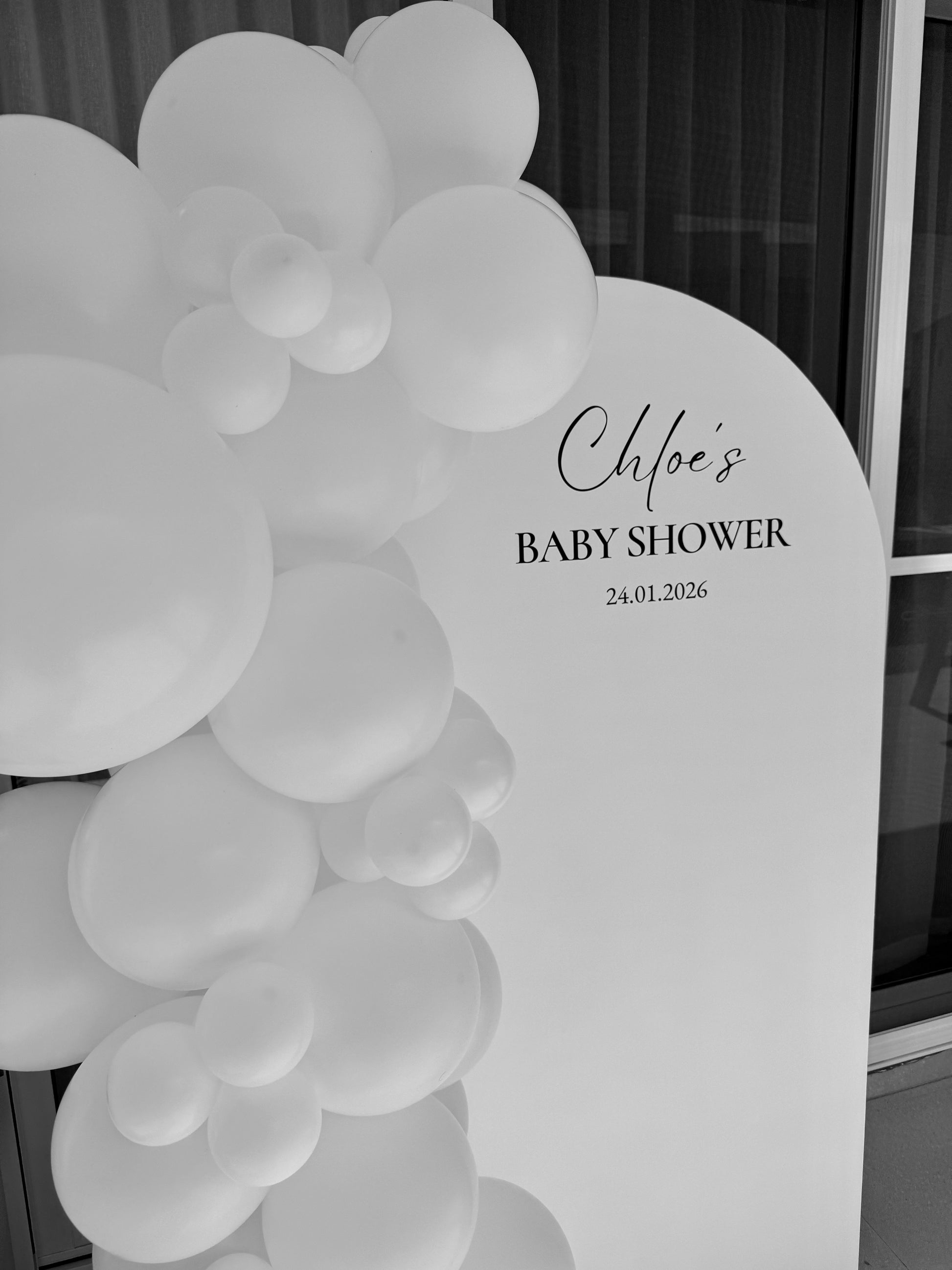 Price includes a standard custom decal on the arch board - ie 'Chloe's Baby Shower' or 'Bella's 21st'.