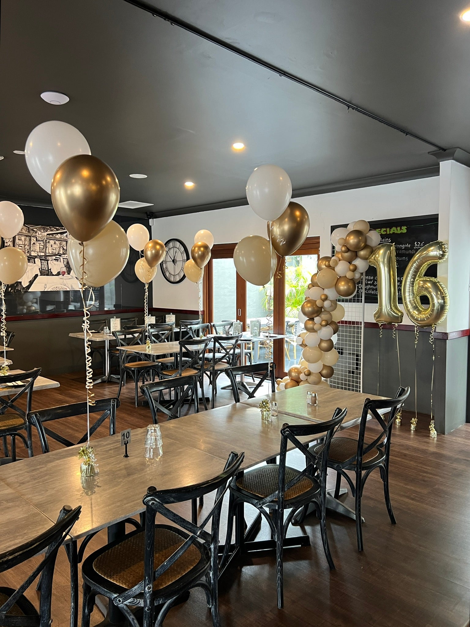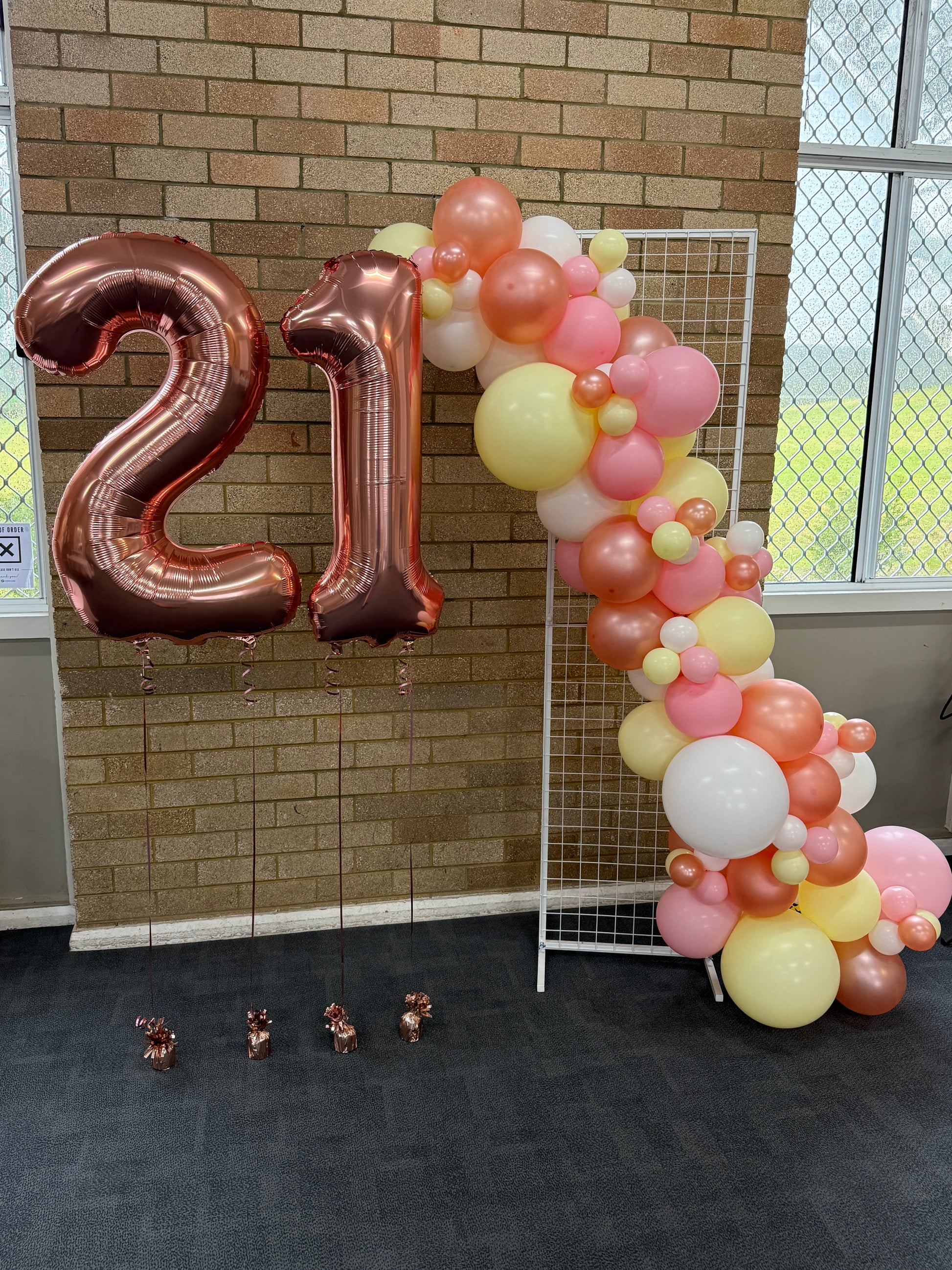 A simple yet effective backdrop for photos and/or cake cutting or simply just to create a feature. Add jumbo numbers or other jumbo foil shape balloons for extra impact.