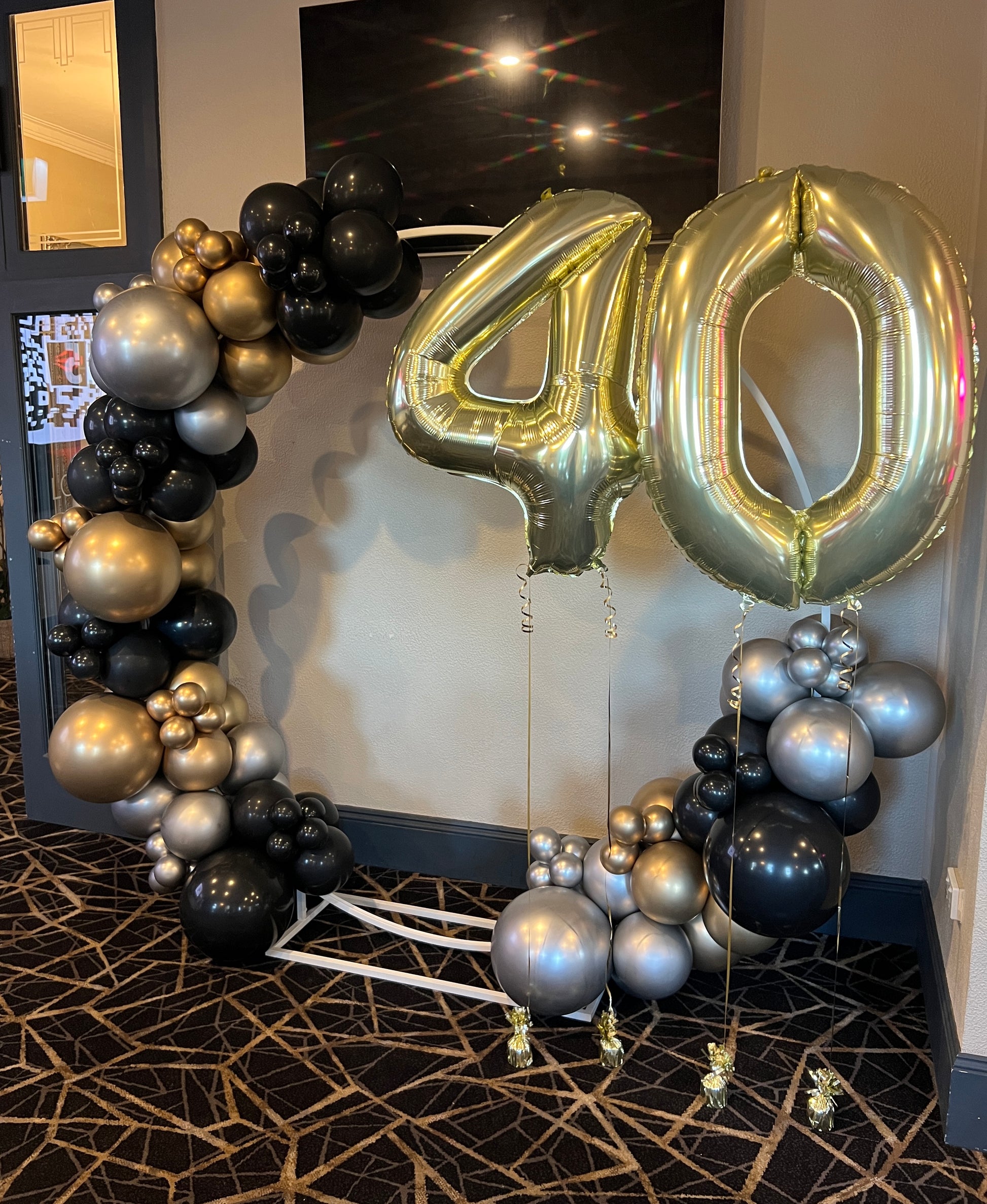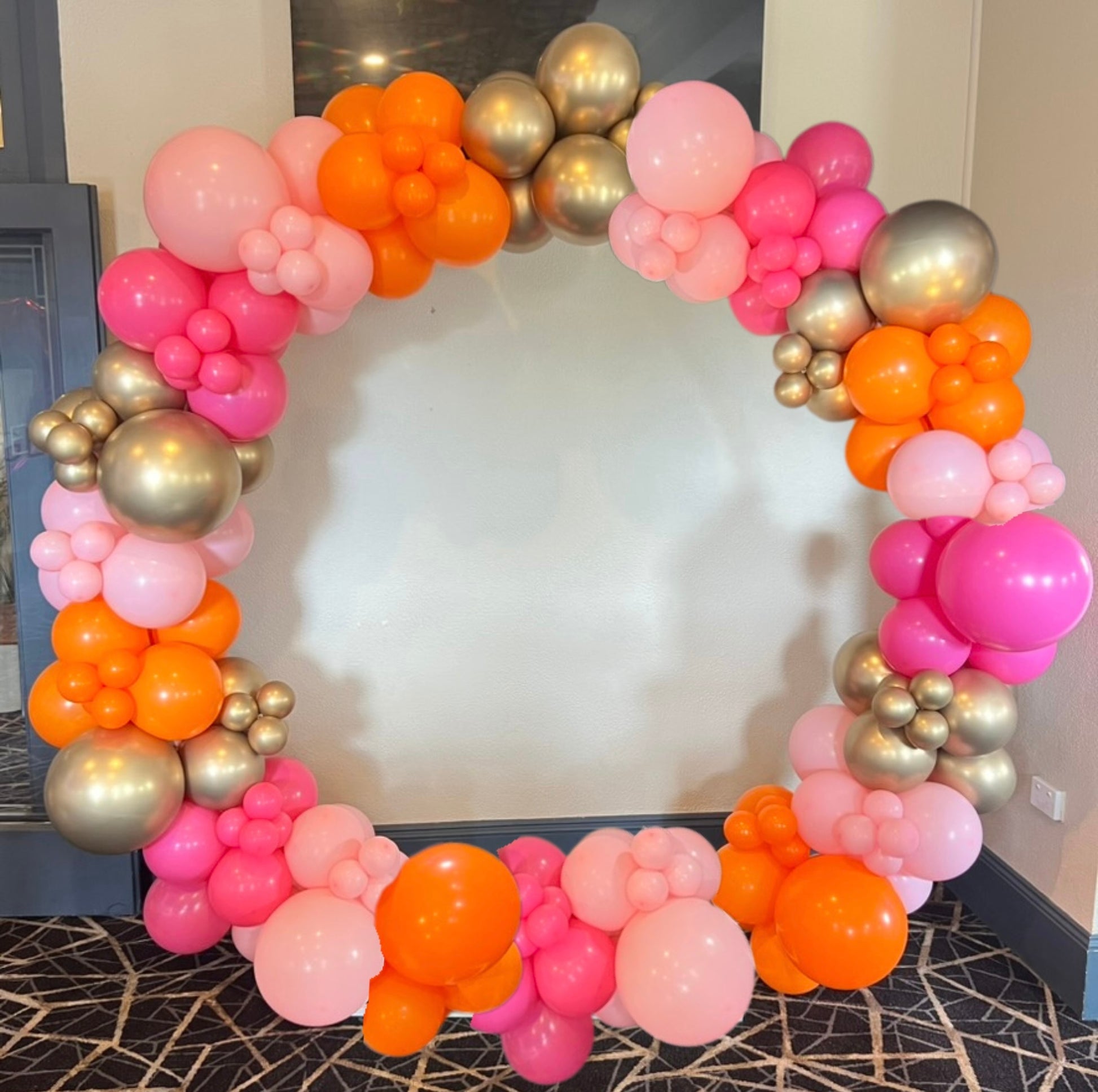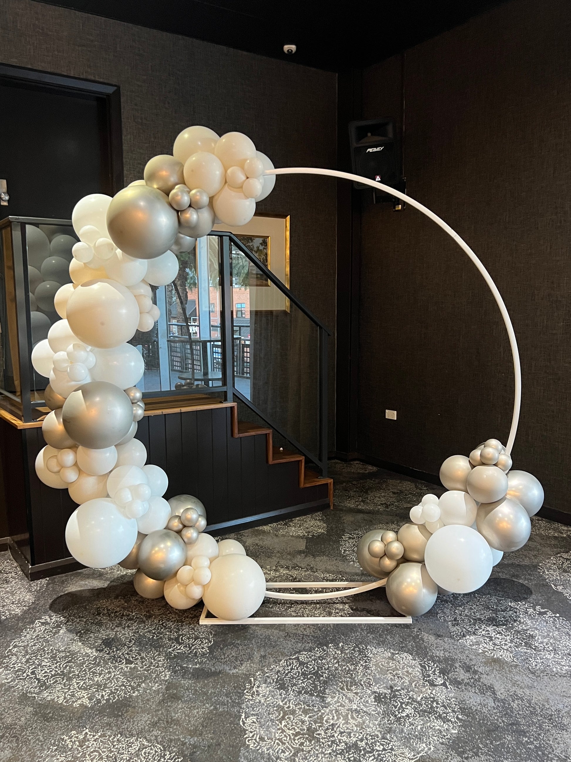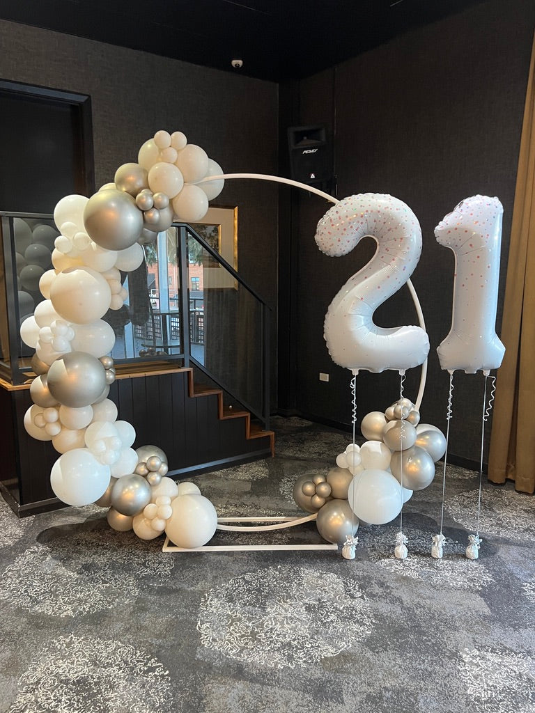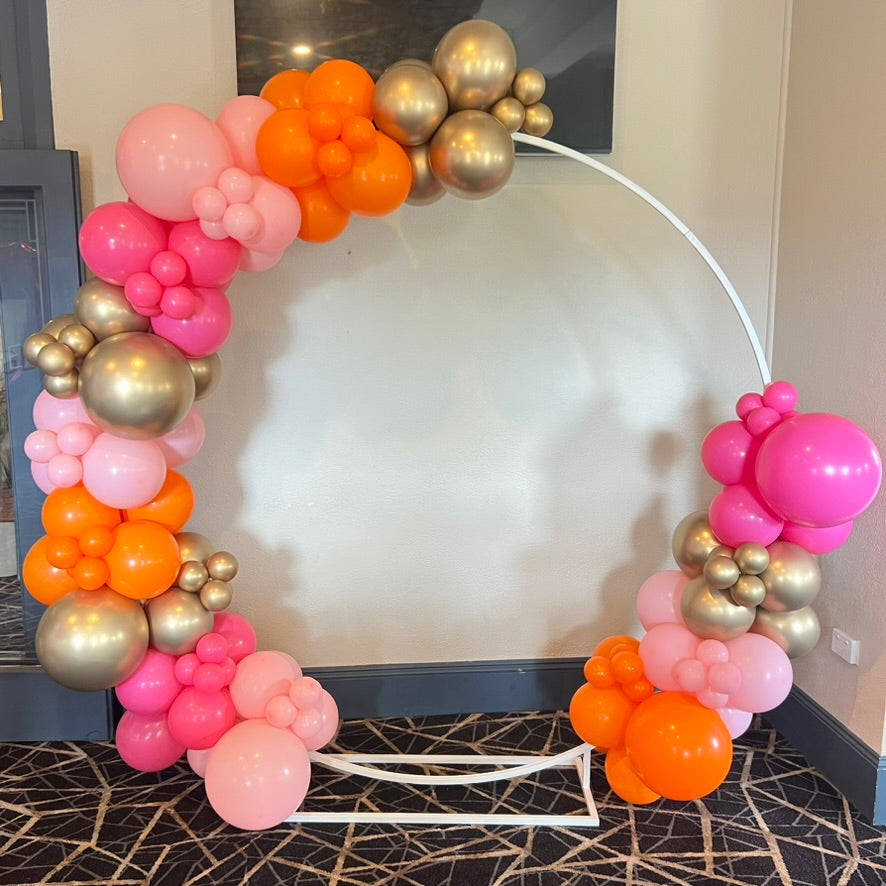 Our round hoop arch with balloon garland is becoming a very popular choice and we can see why! Make an impact with this stunning beauty. Add our jumbo number balloons to pack an extra punch.